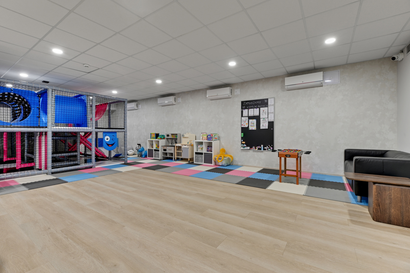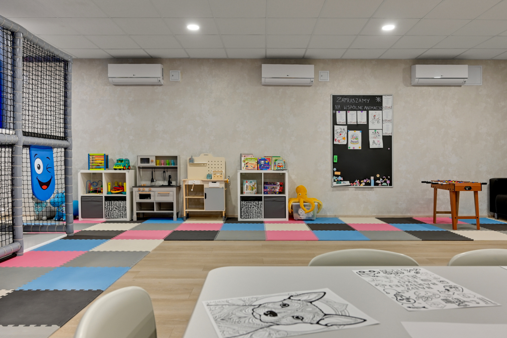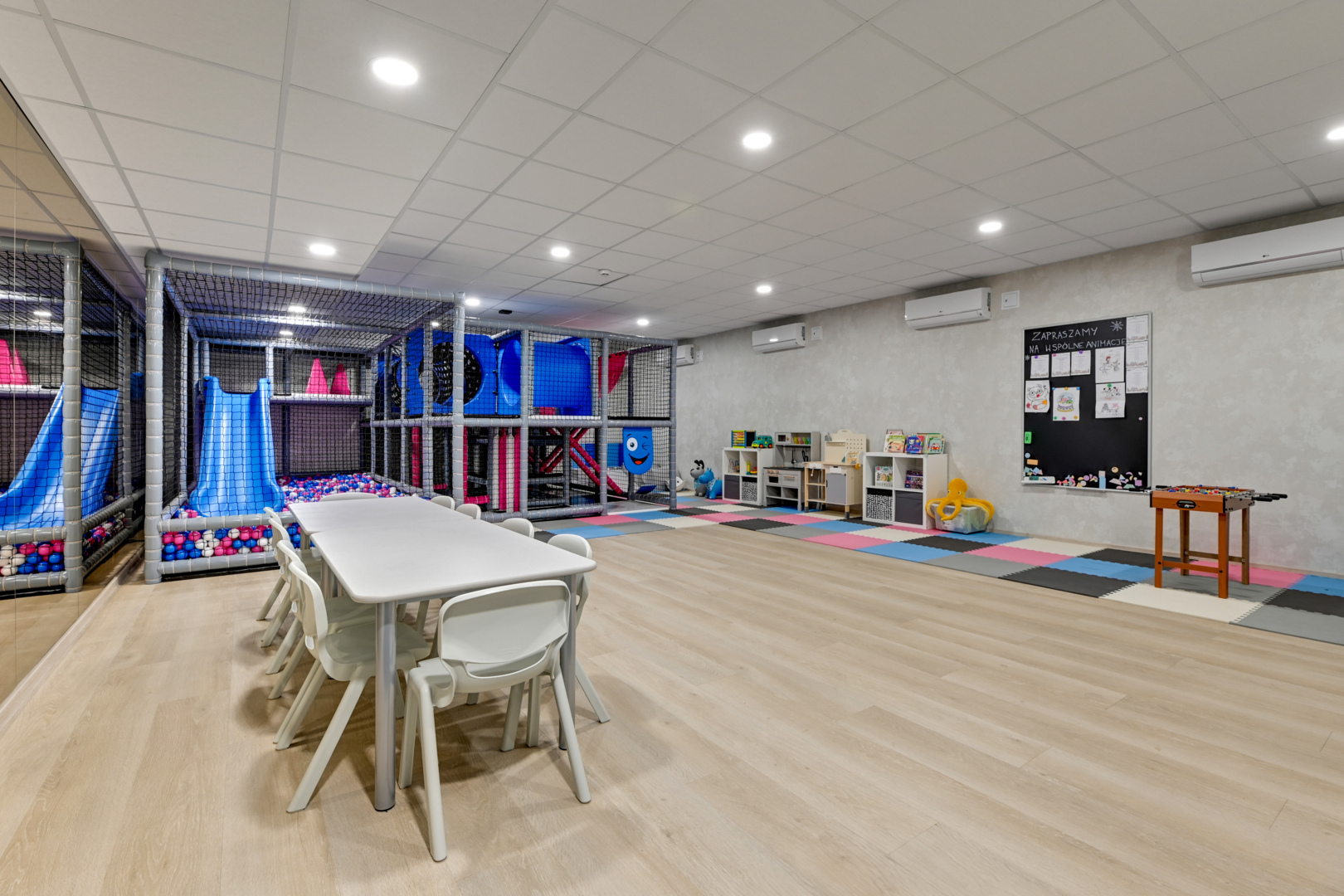 The playroom includes, among others: a colorful obstacles, a slide, a ball pool, games and toys. There is also a games room with a console.